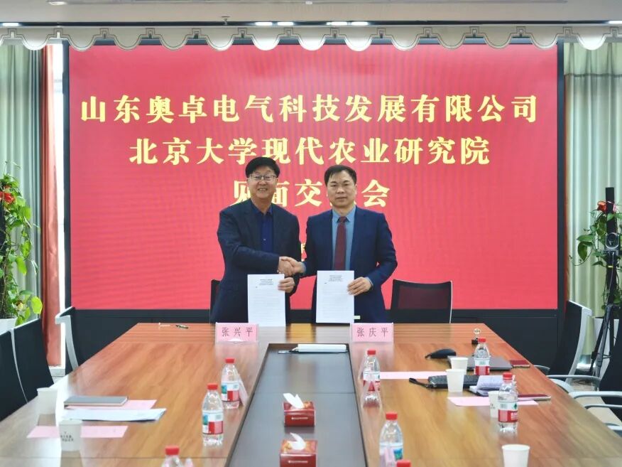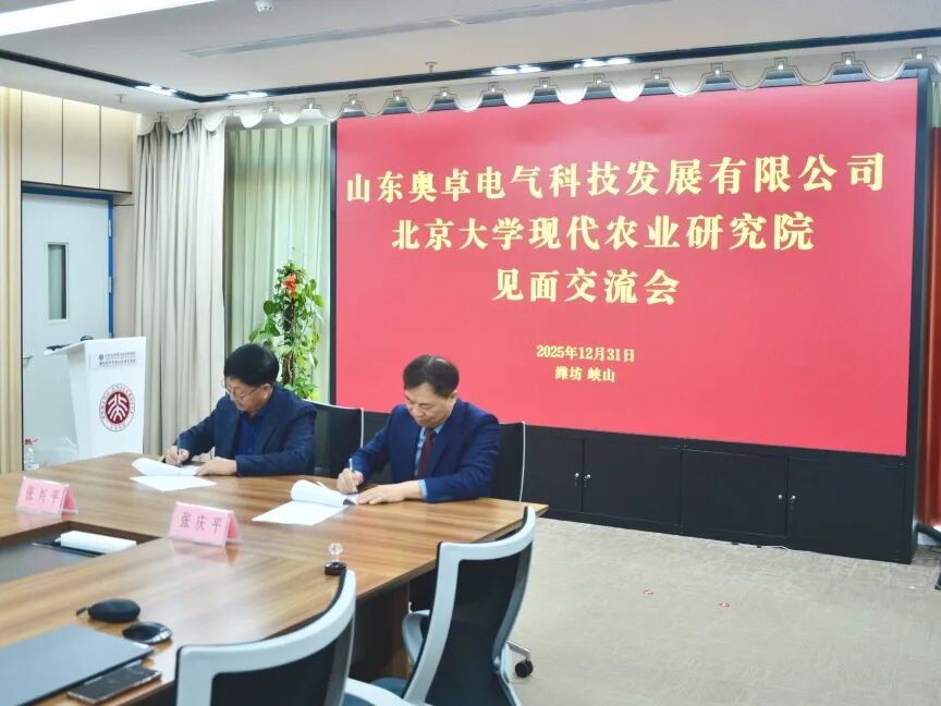 2025年12月31日,山東奧卓電氣科技發(fā)展有限公司董事長張慶平、常務(wù)副總張曉一行赴北京大學(xué)現(xiàn)代農(nóng)業(yè)研究院參觀交流,雙方深度洽談產(chǎn)業(yè)賦能合作事宜,并正式簽訂“農(nóng)業(yè)科技創(chuàng)新與產(chǎn)業(yè)合作框架協(xié)議”。北大現(xiàn)代農(nóng)業(yè)研究院副院長張興平、智慧農(nóng)業(yè)實(shí)驗(yàn)室副研究員王昕、智慧農(nóng)業(yè)研究室資深工程師尹兆剛熱情接待并出席簽約儀式。